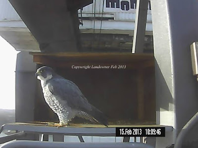 The Falcon had just bought in a feral pigeon and had just begun to feed, the Tiercel resumed a position and was waiting patiently for her to finish, at times not very patiently calling as his hunger overrode her dominance.